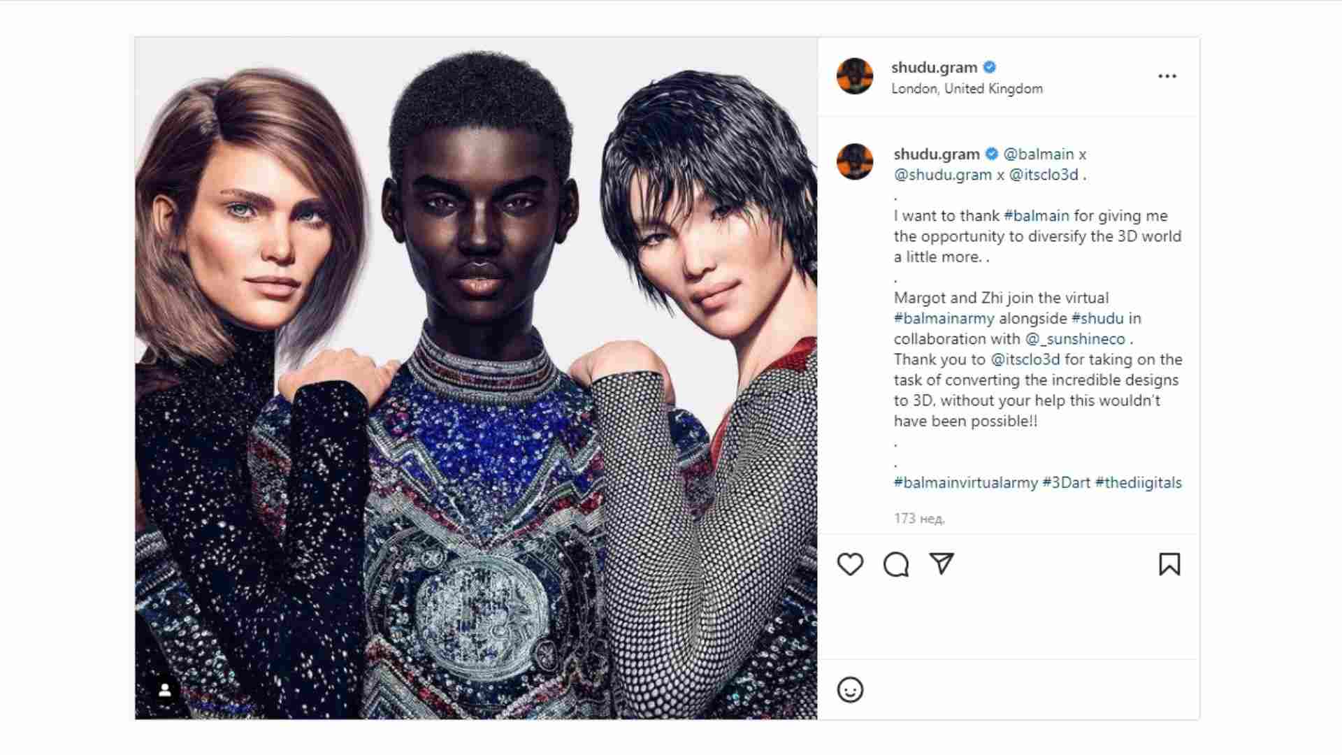 During autumn 2018, French luxury fashion house Balmain turned to influencer star Shudu Gram, having accompanied her with two other supermodels Margot and Zhi. Both were the models of the Balmain brand, and both were animated characters.